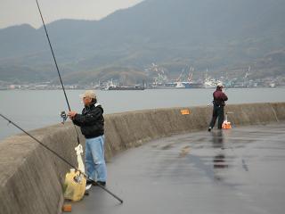 黙々と釣りに専念する右写真の釣りじいさん(手前)、すすむさん(奥)とは