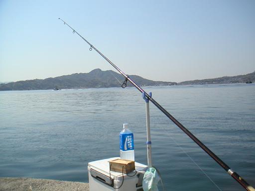 疲れ果てて波止にヘタリ込み、置き竿にして日光浴している最中のもの。時間は午前