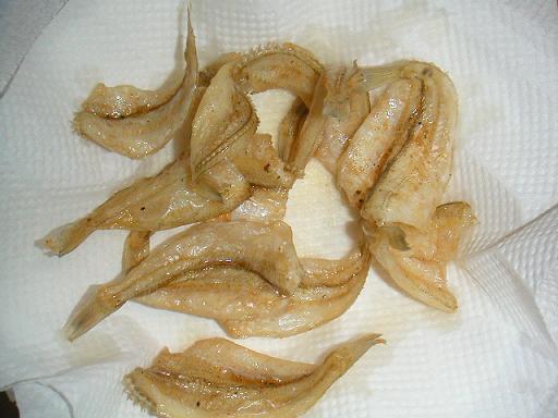 そのまま油で揚げるだけ。水分の飛び具合が悪いと身がくっ付き合いますが、取り上げた