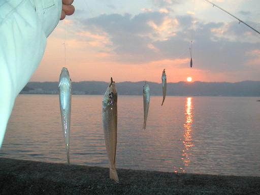 ほど左に移して第4投・・・来たー!「重〜い。」良型混じりの4連じゃー♪朝日に