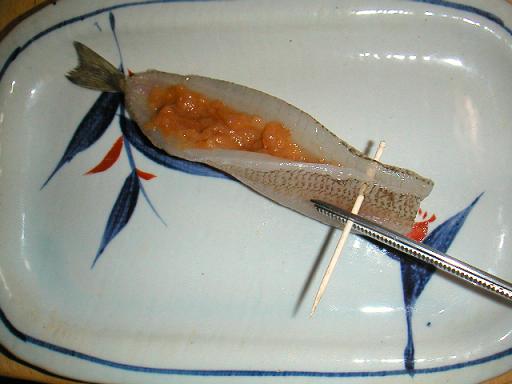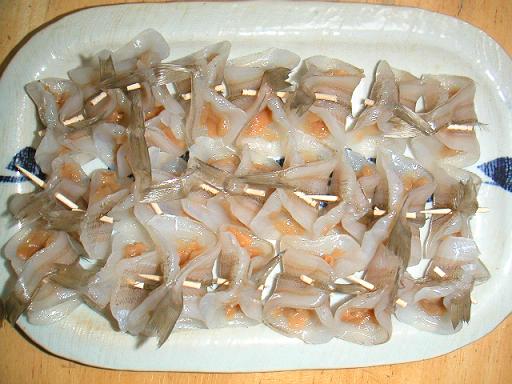 上端の1箇所に楊枝で刺し止めをすればOK.味はピンギスの方が断然美味です。